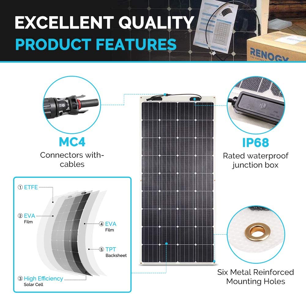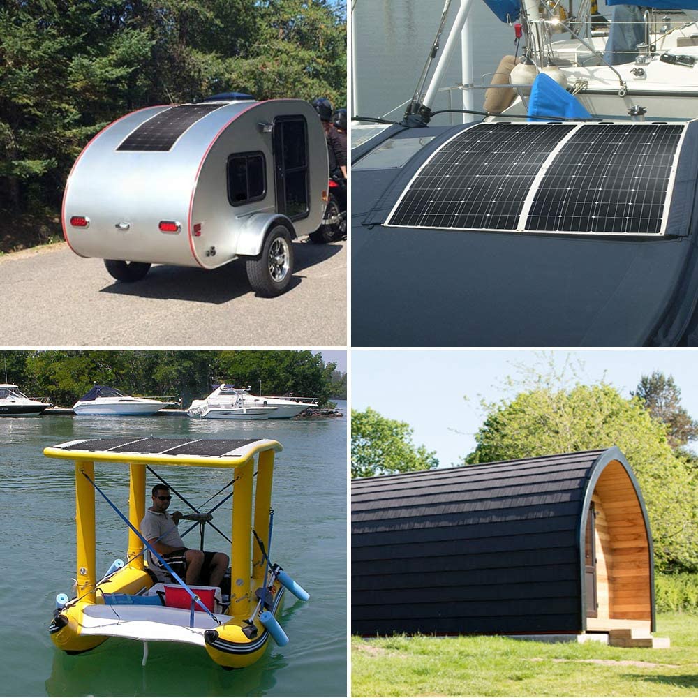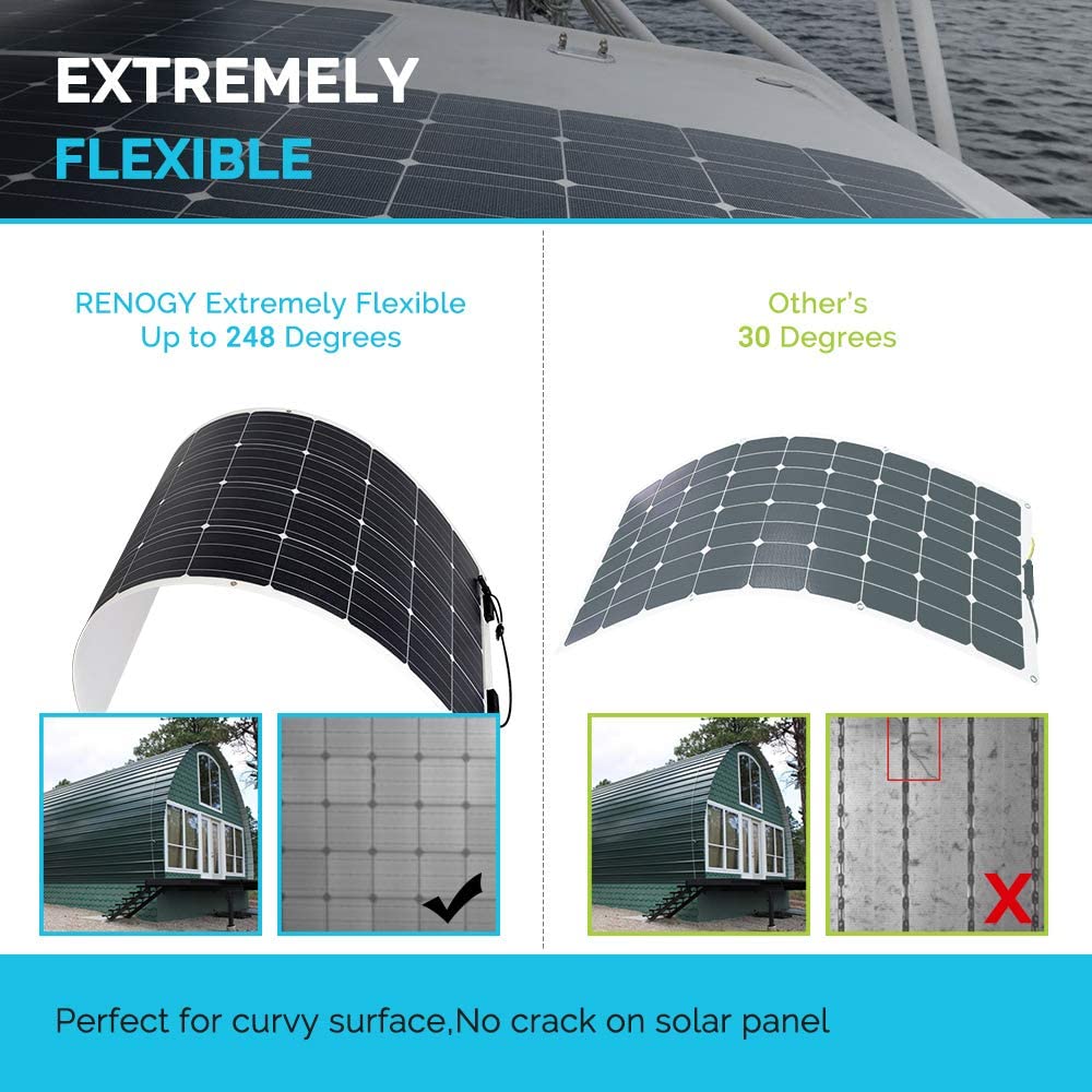 • 【Potential Uses】The Renogy 160 Watt Flexible Monocrystalline Panel can be primarily used on off-grid applications that include rooftop, RV, boats and any curvy surfaces.