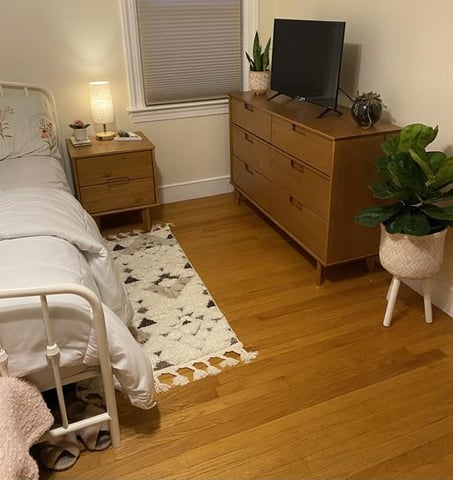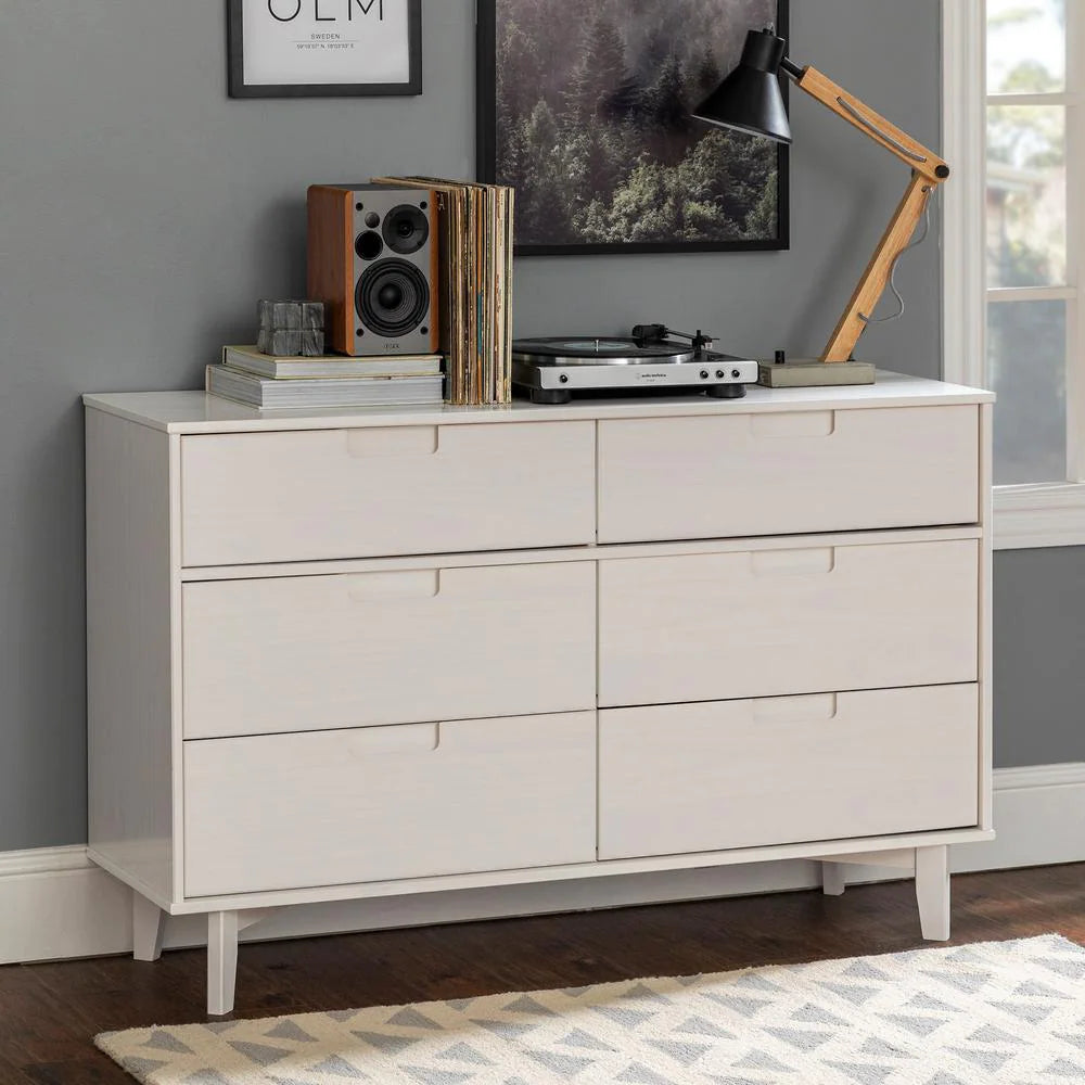Add storage space into your home for your clothing and extra throws or pillows with this 6 drawer dresser. In a stylish, mid century modern design featuring angled legs and cutout handles of solid pine wood in a stained finish. The intriguing design integrates a transitional aesthetic to complement your home dcor. With six storage deep drawers to keep your clothing organized in your bedroom or for blankets and extra bedding in your guest room.