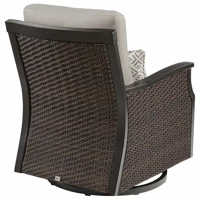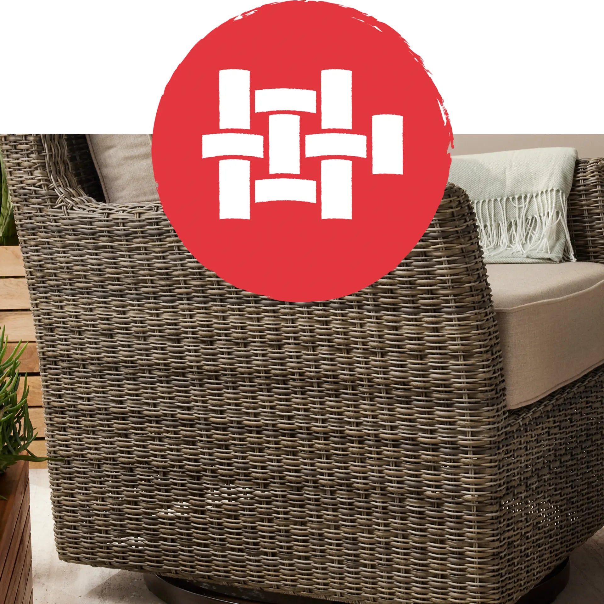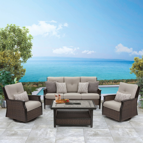 Nothing says relaxation more than spending time outdoors enjoying the company of friends. Serve up some snacks and put your style on display with the Conway 4-piece Woven Deep Seating Set. The sofa, two swivel glider chairs and coffee table all feature an elegant handwoven, all-weather wicker over rust-resistant aluminum frames for long-lasting beauty. The multi-toned wicker is accompanied by deep seating cushions and accent pillows of UV-resistant Sunbrella® fabric for years of easy-care comfort. The coffee table provides ample space for serving up snacks and drinks while entertaining includes a handwoven shelf for convenient storage. Sit back and relax in your new Conway 4-piece Woven Deep Seating Set.