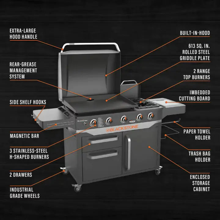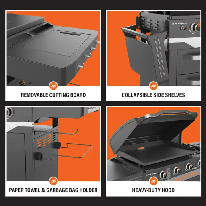 Have everything you need to cook up a feast at one single station with the Blackstone ProSeries 28" Griddle Range Top Combo. Prep and chop your food on the spacious prep shelves that have an embedded cutting board on one side and hooks for hanging tools on both sides. Cleanup is easier with a trash bag holder, and Blackstone's rear grease management system. Storage is also smarter with this unit thanks to the folding prep shelves and enclosed storage space. Use the hood to baste or smoke food, and to help protect your griddle surface when not in use. A hard cover for the range top is also included that can hang on the back of the unit while the side burners are being used. Impress your family and friends at your next backyard barbeque with the sleek, multi-functional ProSeries Griddle Combo.