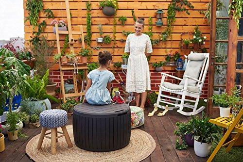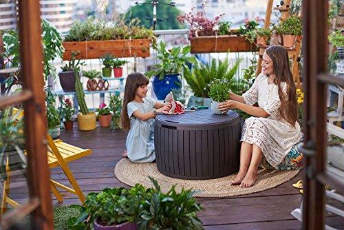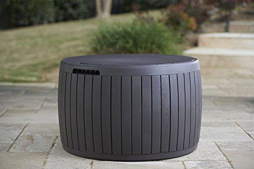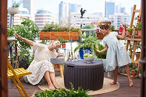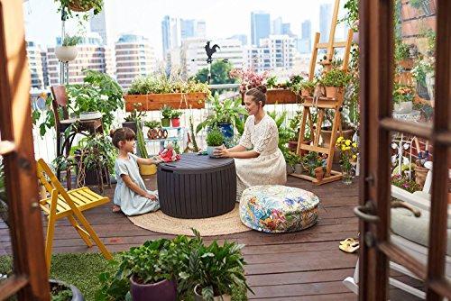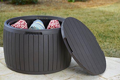 • Keter Circa 37 Gallon Round Deck Box, Patio Table for Outdoor Cushion Storage, Brown