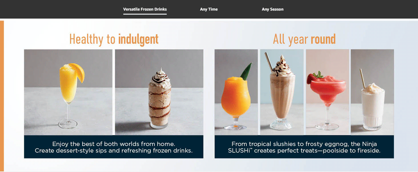 5 preset settings: Slush, Spiked Slush, Frappé, Milkshake, Frozen Juice. Temperature control lets you customize whether you want the output to be thicker or thinner than the preset.