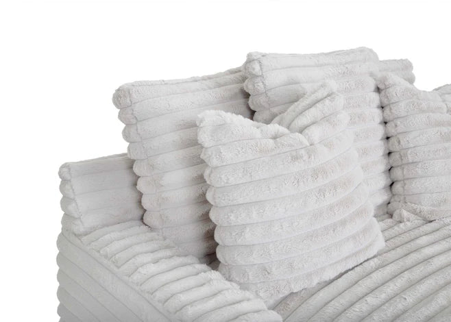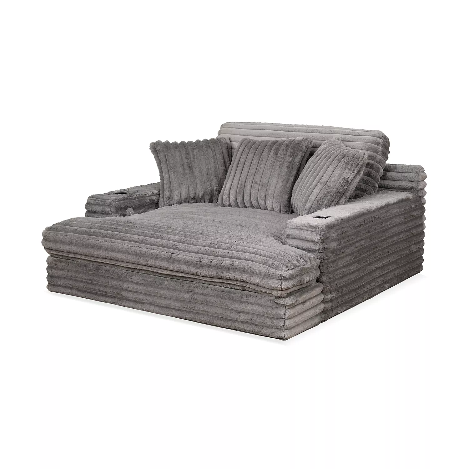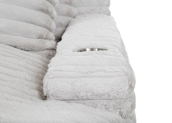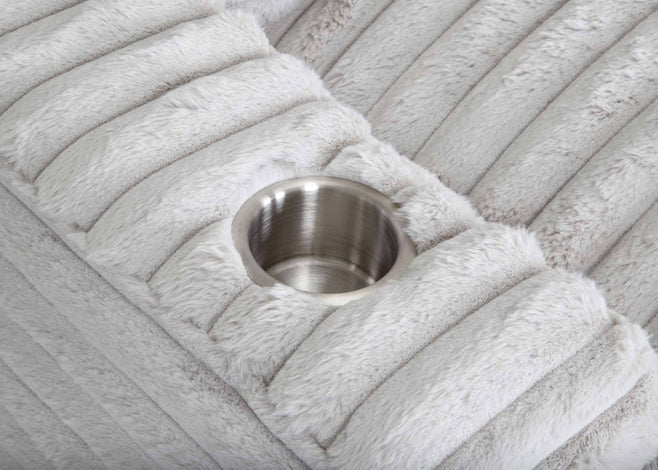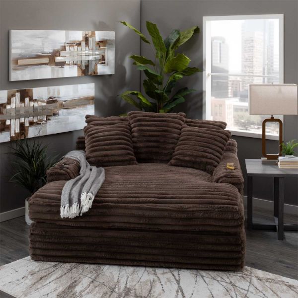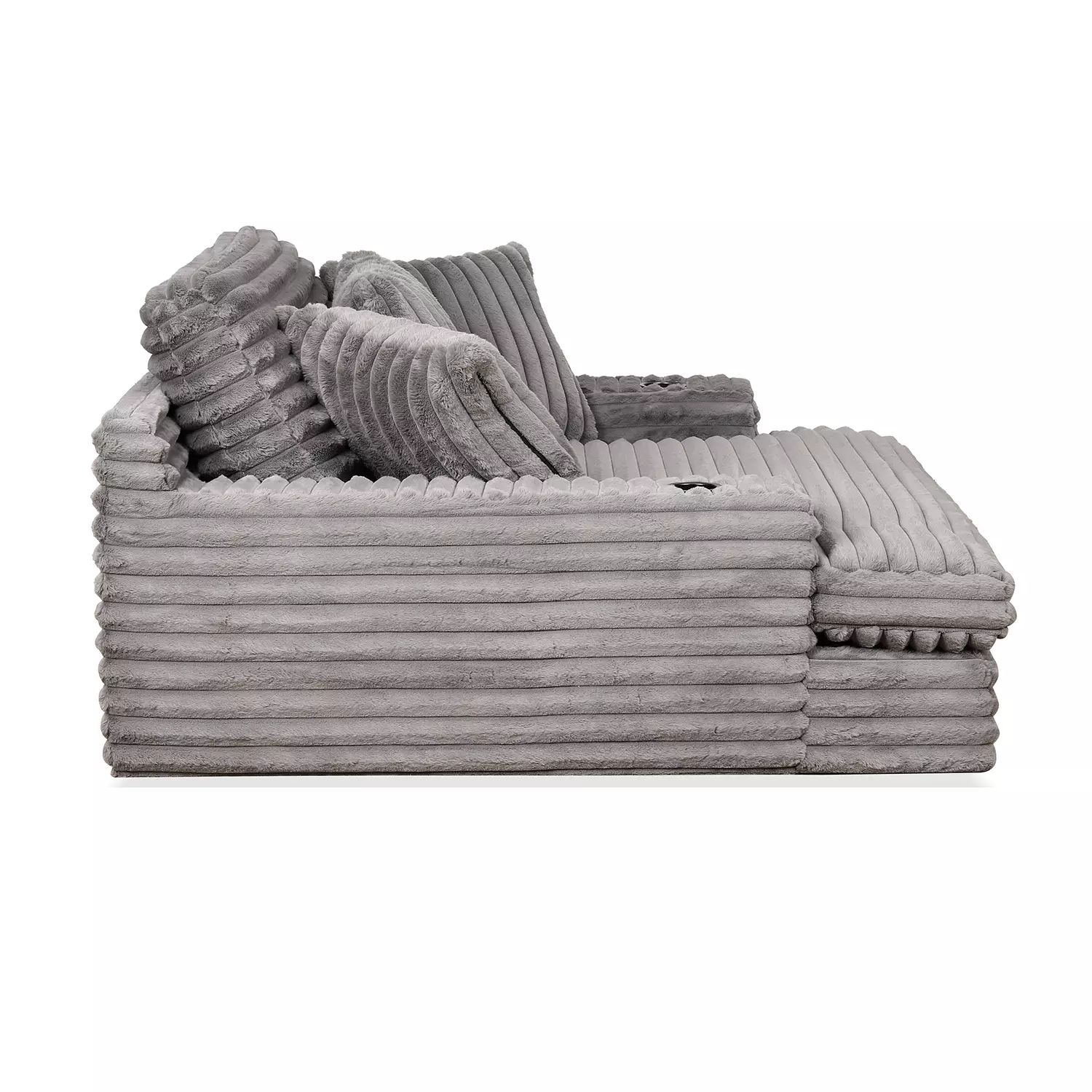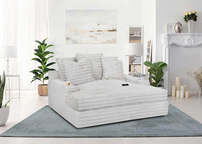 Our chaise lounge is the perfect addition to your living room for ultimate relaxation. Its ultra-dense, soft luxurious feel is made with wide, super soft corduroy fabric that is both durable and stylish. The chaise lounge has a lofty appearance and is accompanied by three back pillows and two down filled toss pillows for added comfort. With two USB ports, you can conveniently charge your electronic devices while lounging. And with two cupholders, you can easily enjoy your favorite beverage without having to get up. Whether you are watching a movie or reading a book, our Chaise Lounge is the perfect spot to unwind and relax.