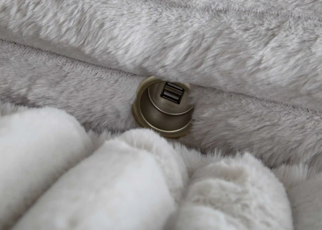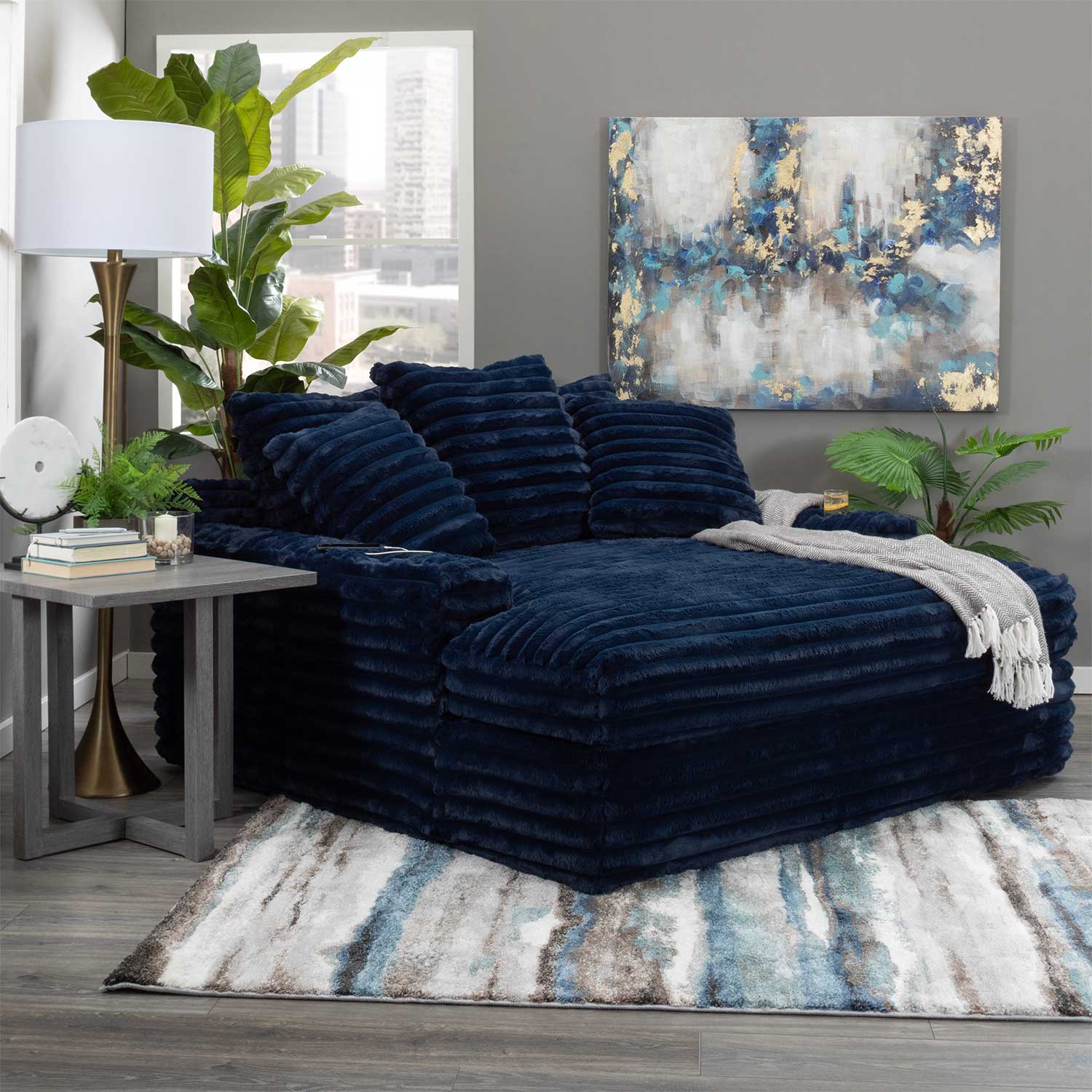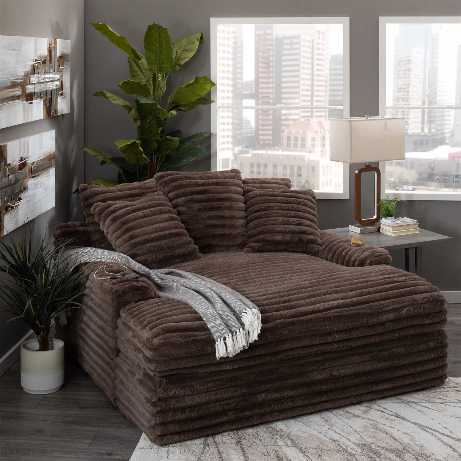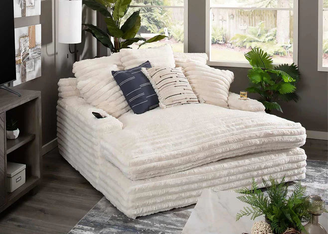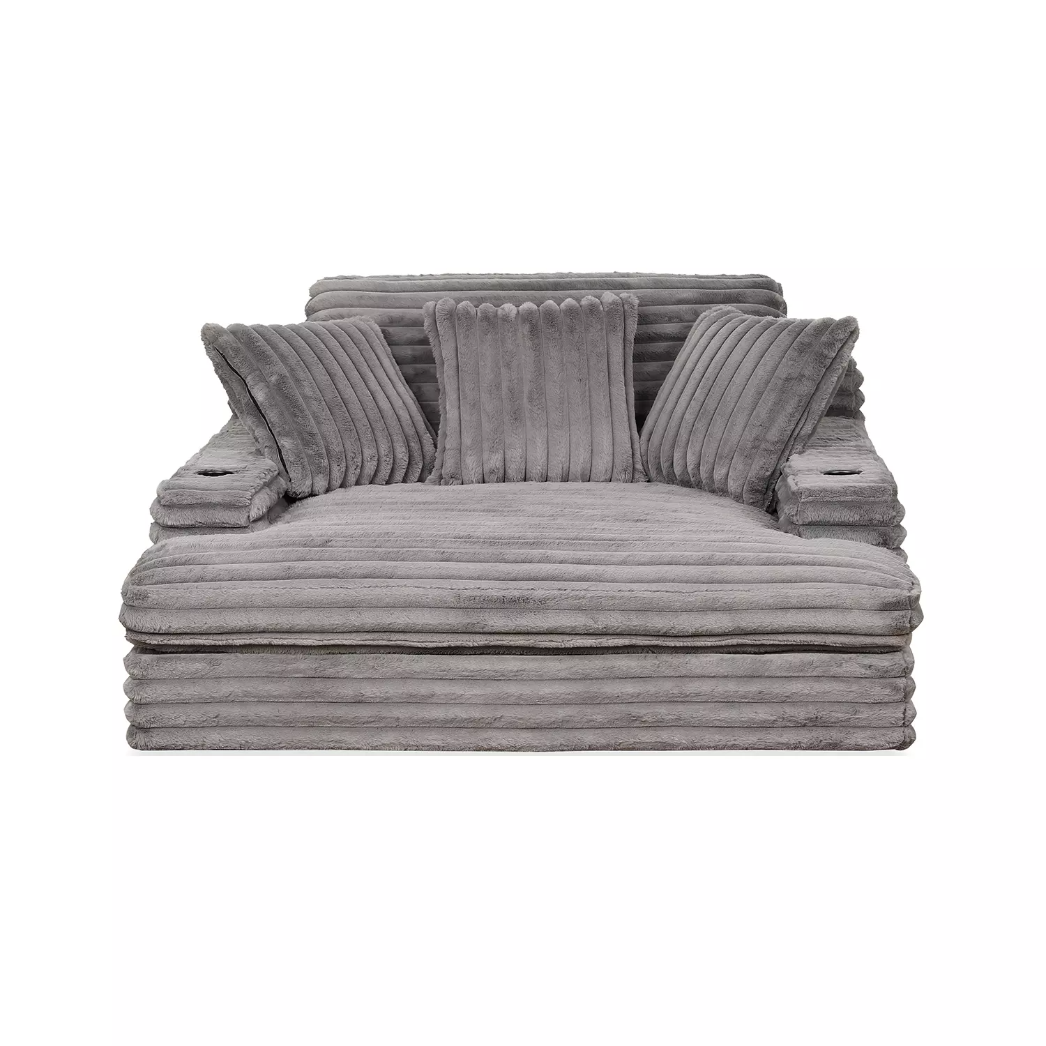 Our chaise lounge is the perfect addition to your living room for ultimate relaxation. Its ultra-dense, soft luxurious feel is made with wide, super soft corduroy fabric that is both durable and stylish. The chaise lounge has a lofty appearance and is accompanied by three back pillows and two down filled toss pillows for added comfort. With two USB ports, you can conveniently charge your electronic devices while lounging. And with two cupholders, you can easily enjoy your favorite beverage without having to get up. Whether you are watching a movie or reading a book, our Chaise Lounge is the perfect spot to unwind and relax.