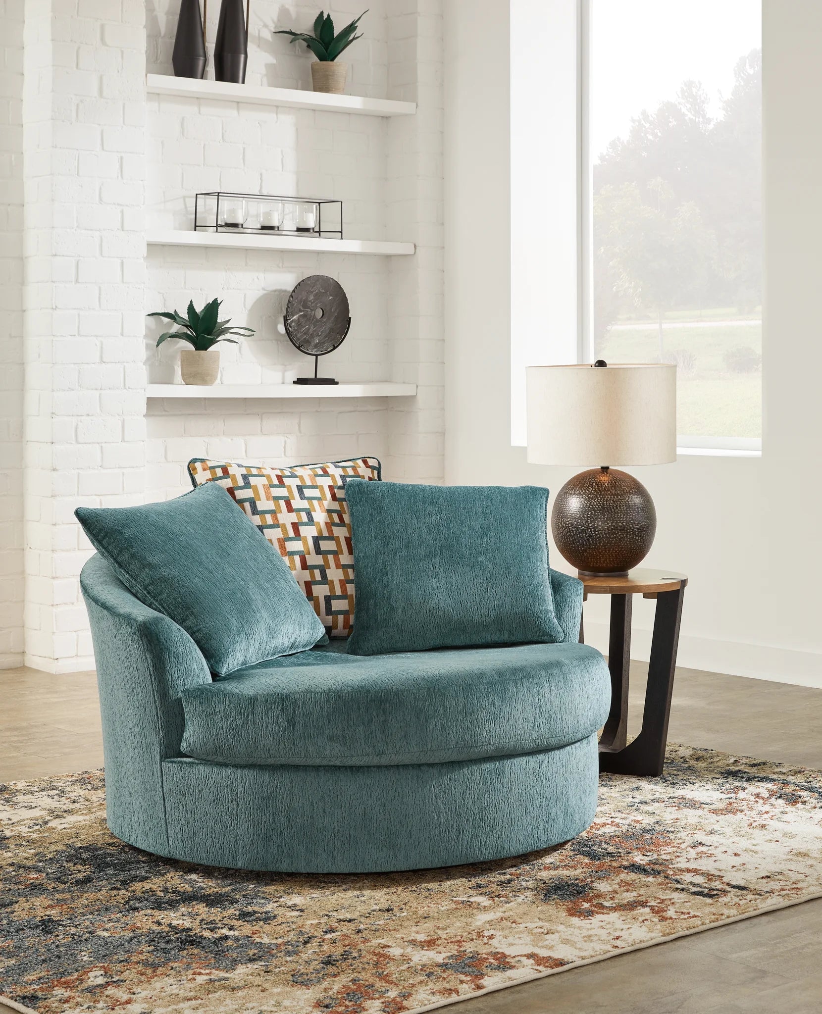 Express your uniquely chic style with this oversized swivel accent chair. Its fresh approach to color creates a vibrant yet refined vibe in your living room that friends and family will love to lounge in. And you can count on classic comfort—the chair’s plush upholstery keeps day-to-day relaxation in mind along with a 360-degree swivel to complete the curated look.