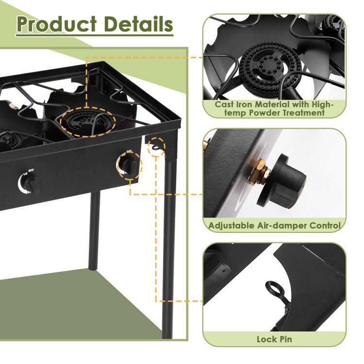 - DETACHABLE LEGS - This outdoor stove triple burner features legs that can be detached, making it compact for easy transportation and storage.