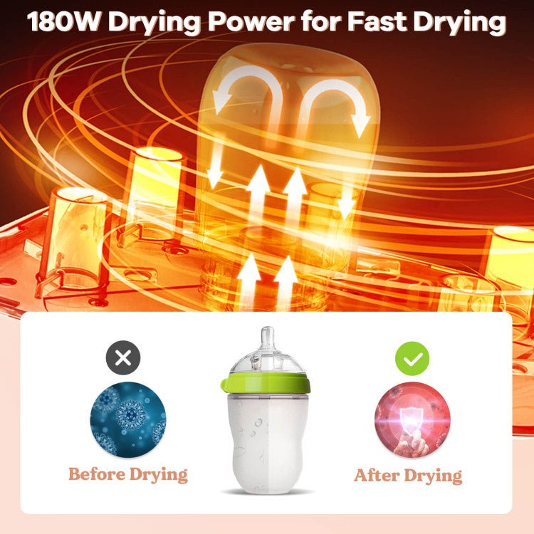 Say goodbye to the hassle of manually sterilizing your baby's bottles, wasting precious time and effort. Our bottle sterilizer and dryer combo does it all for you with just a press of a button. With its large capacity, you can sterilize and dry up to 10 bottles, pacifiers, and other baby essentials all at once, making it perfect for busy parents.