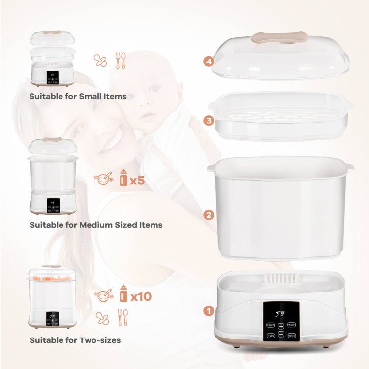 - DRYING AND HEATING FUNCTION -�This baby bottle steam sterilizer is not only equipped with basic disinfection function, but also has drying and heating functions. After sterilization, hot air can be used for fast drying. Apart form that, you can also use it to heat milk bottles.