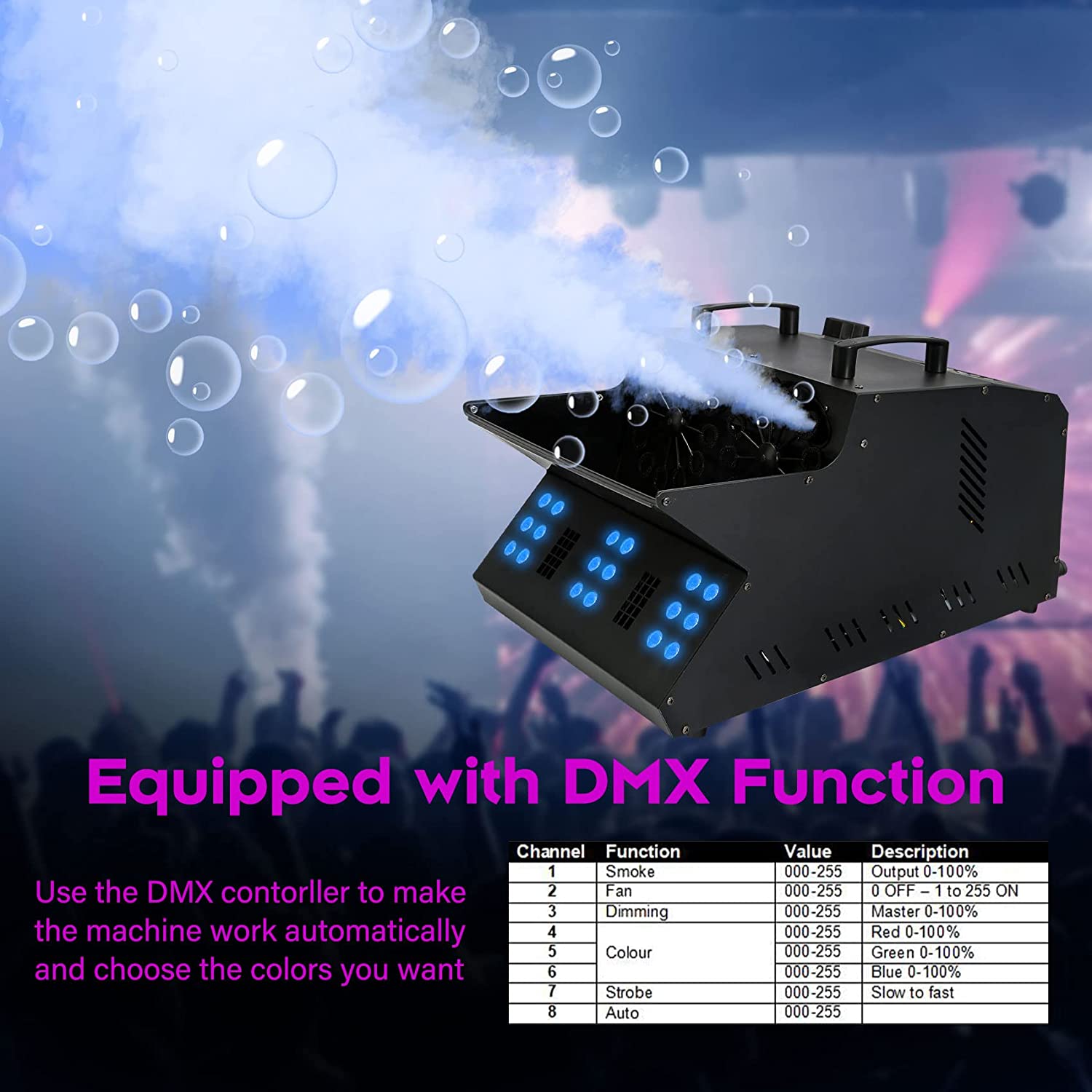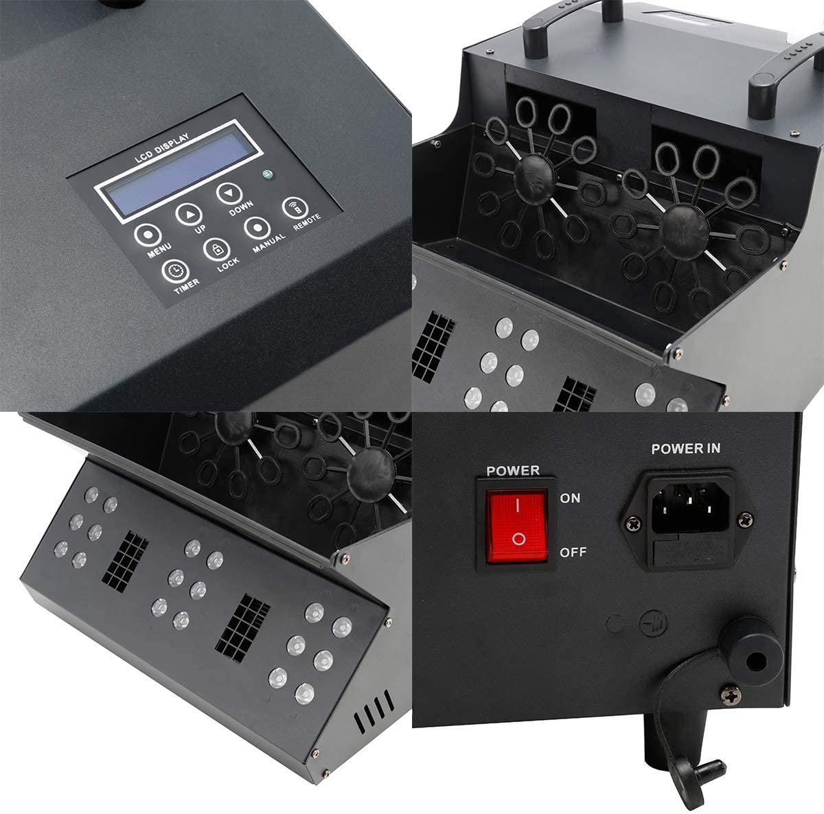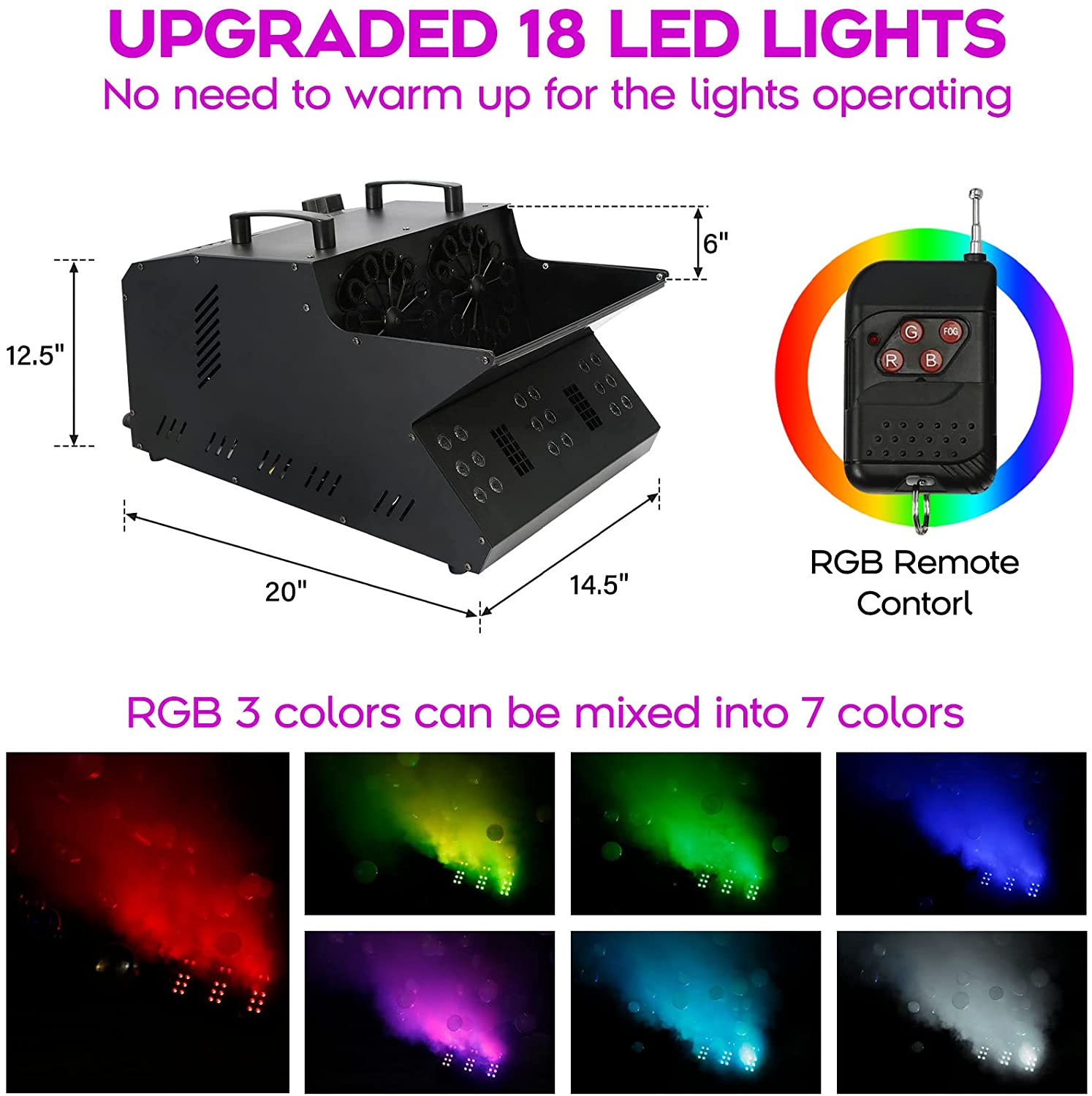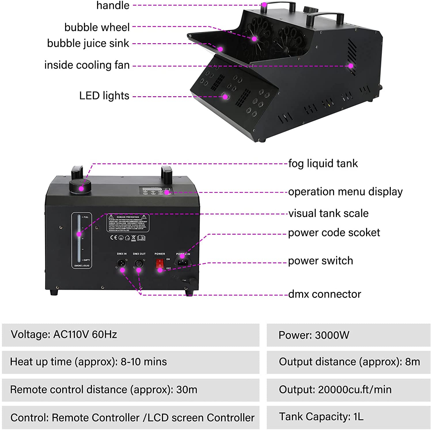 • ?Large Capacity & High Power- 3000W fog bubble machine with lights has a 1L fog liquid capacity tank. Output distance is up to 12-15ft (No wind conditions). Using the machine along the wind direction can lengthen the spray distance. Output : 20000cu.ft/min
